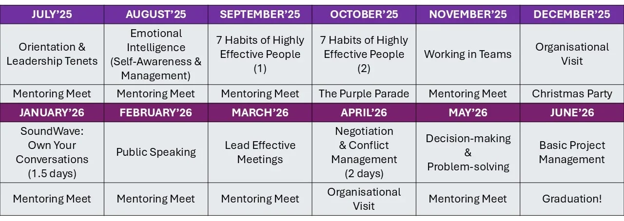 The Purple Parade Ltd (TPPL) Leadership Development Programme (LDP) is a curated series of best-of-class leadership workshops and activities to equip individuals with personal mastery, effective teamwork, and organisational leadership skills, tailored for the learning needs of persons with disabilities.